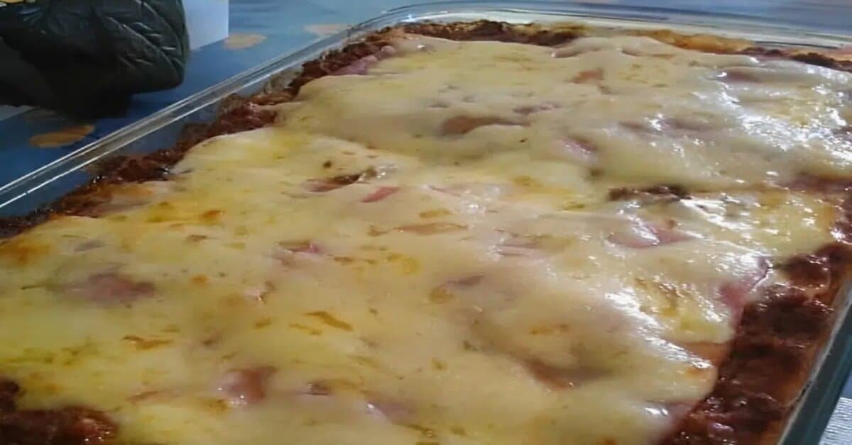 - Coloque uma camada de massa, presunto, muçarela e o molho. Repita.