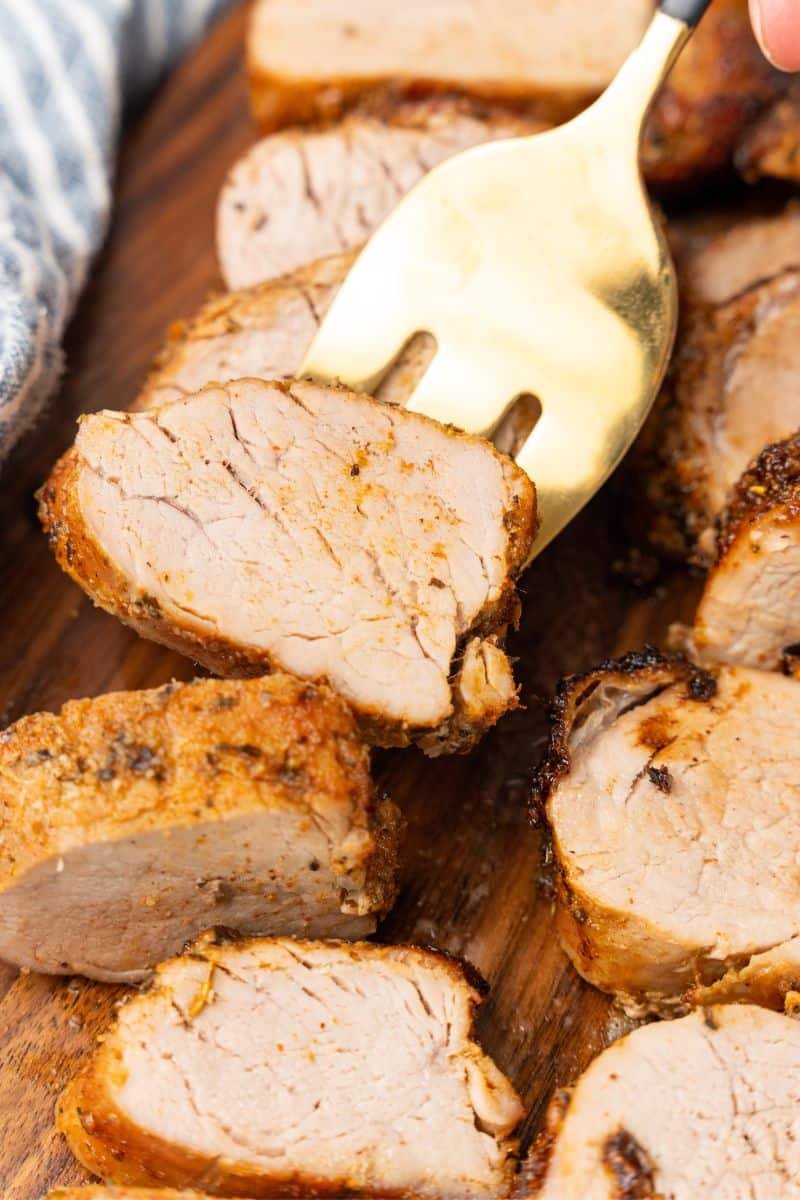 O lombo de porco deve ser cozido a 145 graus usando um termômetro de músculos do dedo em seu ponto mais grosso. Deve resfolgar por pelo menos 3 minutos em seguida o decocção antes de fatiar.
