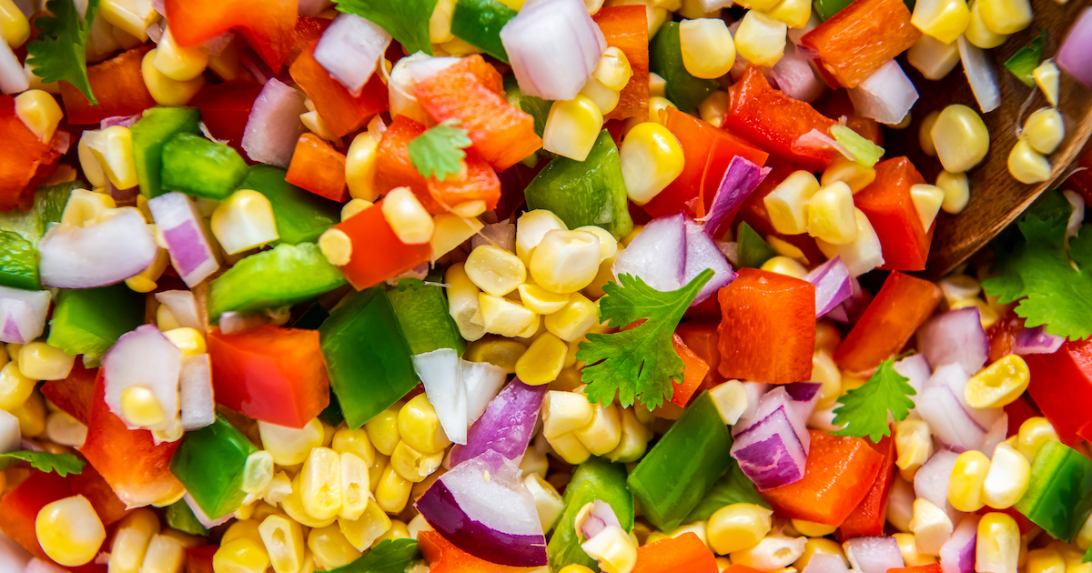Fresco, fresco, fresco! Os ingredientes crus fazem uma grande diferença nesta receita de salsa fresca. Milho gulodice, jalapeño picante e cebola roxa misturados com suco de limão espremido na hora é uma explosão de sabor.