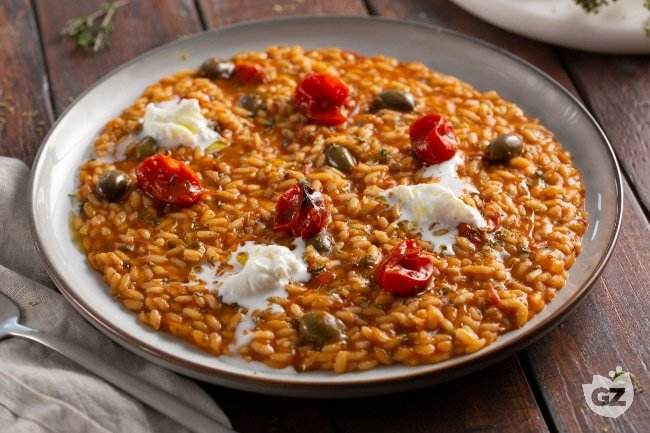 Nossa pizza de risoto Napoli é um primeiro prato inspirado em um dos sabores de pizza mais amados, a pizza napolitana, que contém sabores e aromas tipicamente mediterrâneos! Os inevitáveis são definitivamente: magnífico tomate, alcaparras, anchovas e muito orégano! Comecemos pelos tomates: optamos por usar tomates cherry, assados no forno que vão dar ao prato toda a sua mel. Alcaparras, anchovas e azeitonas darão um toque salso e saboroso, enquanto o risoto carnaroli é certamente o mais adequado para obter uma cremosidade única. O toque extra serão os pedaços de burrata adicionados por último… podemos prometer que o sucesso é guardado com nascente prato!